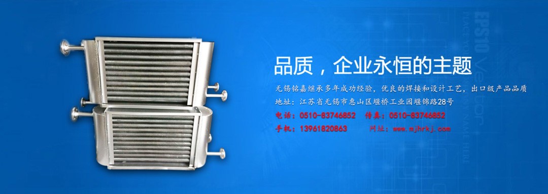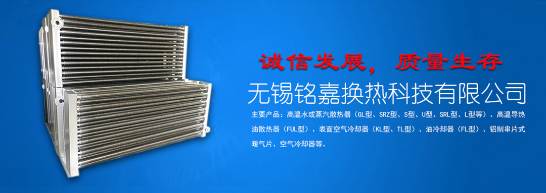 無錫銘嘉換熱科技有限公司是生產散熱器的專業工廠。 產品有:高溫水或蒸汽散熱器、高溫導熱油散熱器、表面空氣冷卻器、油冷卻器、鋁制串片式暖氣片、空氣冷卻器翅片管換熱器